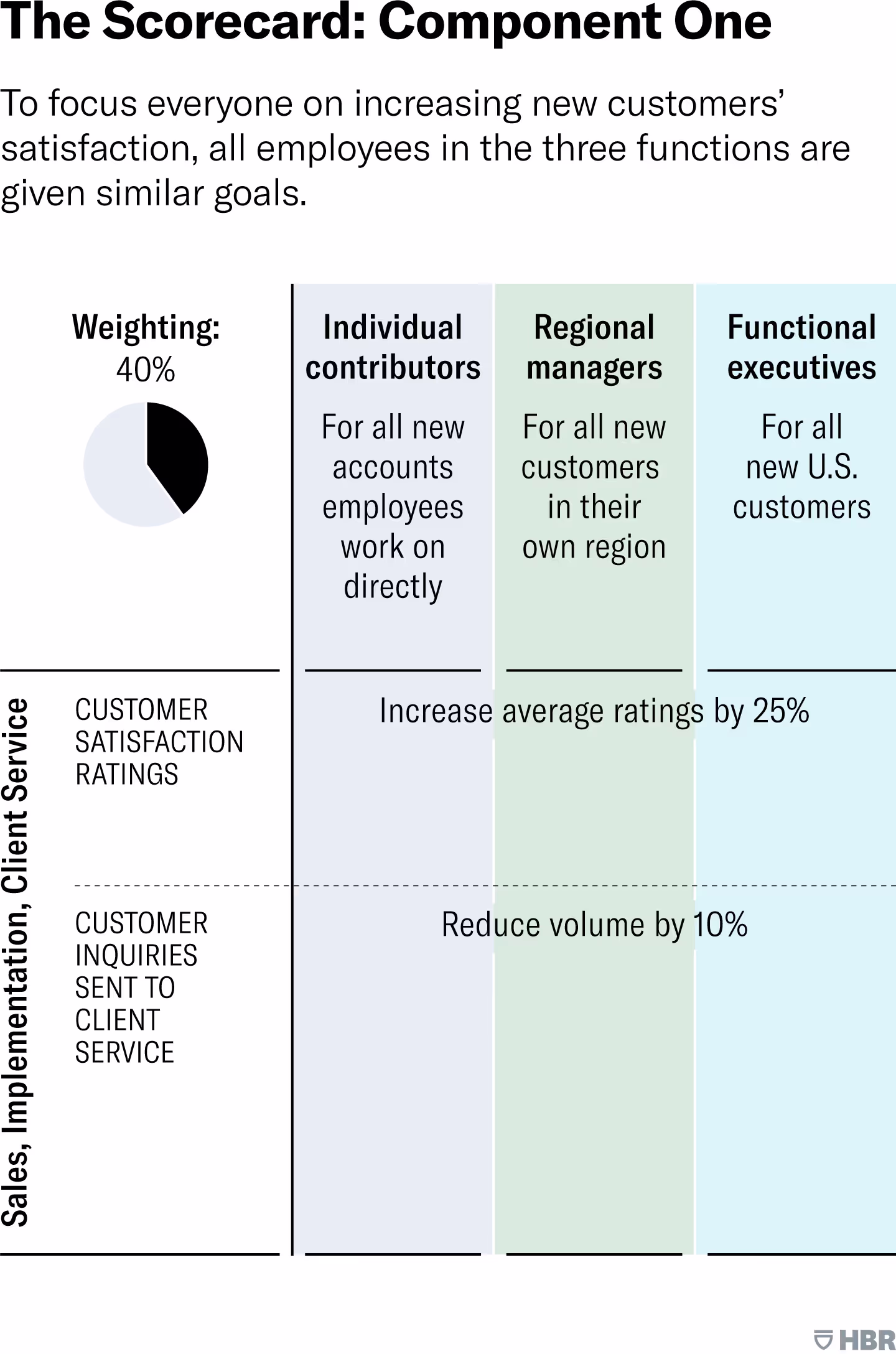 Well-designed individual targets not only promote personal accountability but also directly connect to team and organization-wide objectives. They help each person understand how his or her specific actions contribute to higher-level success. Let’s look at TechCo’s client service teams. Under the old system, individual help specialists had been evaluated just on how long it took them to resolve each client inquiry and how many inquiries each person completed in a day. Those metrics drove high productivity but not customer satisfaction. Service specialists had no incentive to address underlying issues such as poor data quality, which stemmed from the failure to modify the software for each customer’s needs. The new system, in contrast, motivated the client service professionals—who had real-time, sometimes visceral perspectives on customers’ experiences—to be more proactive. The company began by creating three task forces, drawing members from all three departments, to solve common problems that led to customer inquiries. One task force focused on improving data quality, another on increasing on-time implementation, and the third on using artificial intelligence to enhance operations. Each task force was led by a regional manager and sponsored by a functional executive from a different department, who coached the regional manager and helped the task force get resources. The scorecards of the individual members included a goal of proposing solutions to the problem each group was addressing. (The regional managers leading the task forces were accountable for implementing those solutions and were asked to reduce the number of inquiries related to data quality by 20%, increase on-time implementation by 30%, and introduce AI into three processes, respectively.) The third part of the client service professionals’ scorecards also included individual goals for their “day job” of handling inquiries from customers they were assigned to. (Giving everyone in a team personal targets related to the team goals is important to discourage free-riding and stop members from worrying that others won’t do their share.) Altogether the component-three goals were weighted 15%. That was large enough to instill a strong sense of personal accountability while still ensuring collaboration on the higher-level goals.